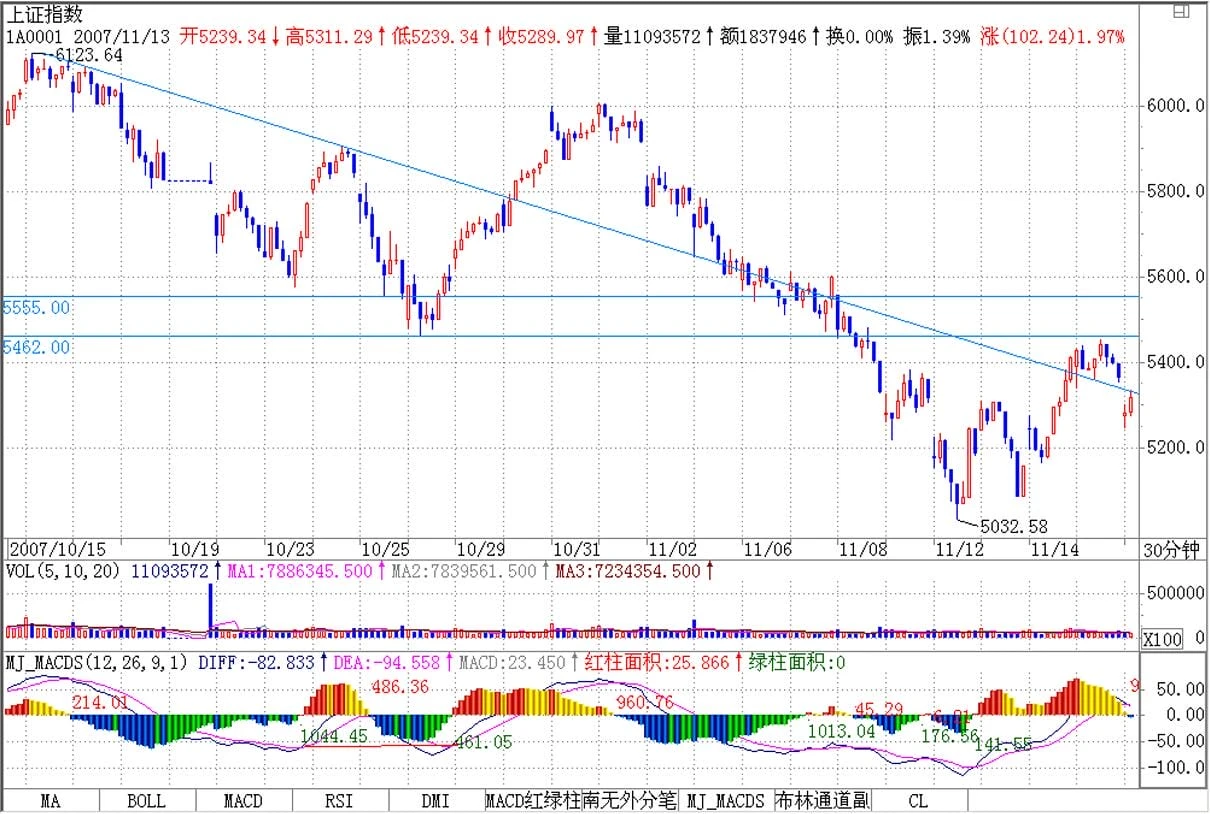 更通俗地说,就是以5月均线陷阱对5462-5555点颈线的例行反抽继续展开,注意,反抽可不一定要一定碰到5462上,最弱的反抽,就是装模作样在颈线下面折腾几天,然后就和5月均线吻别于狂乱的夜。