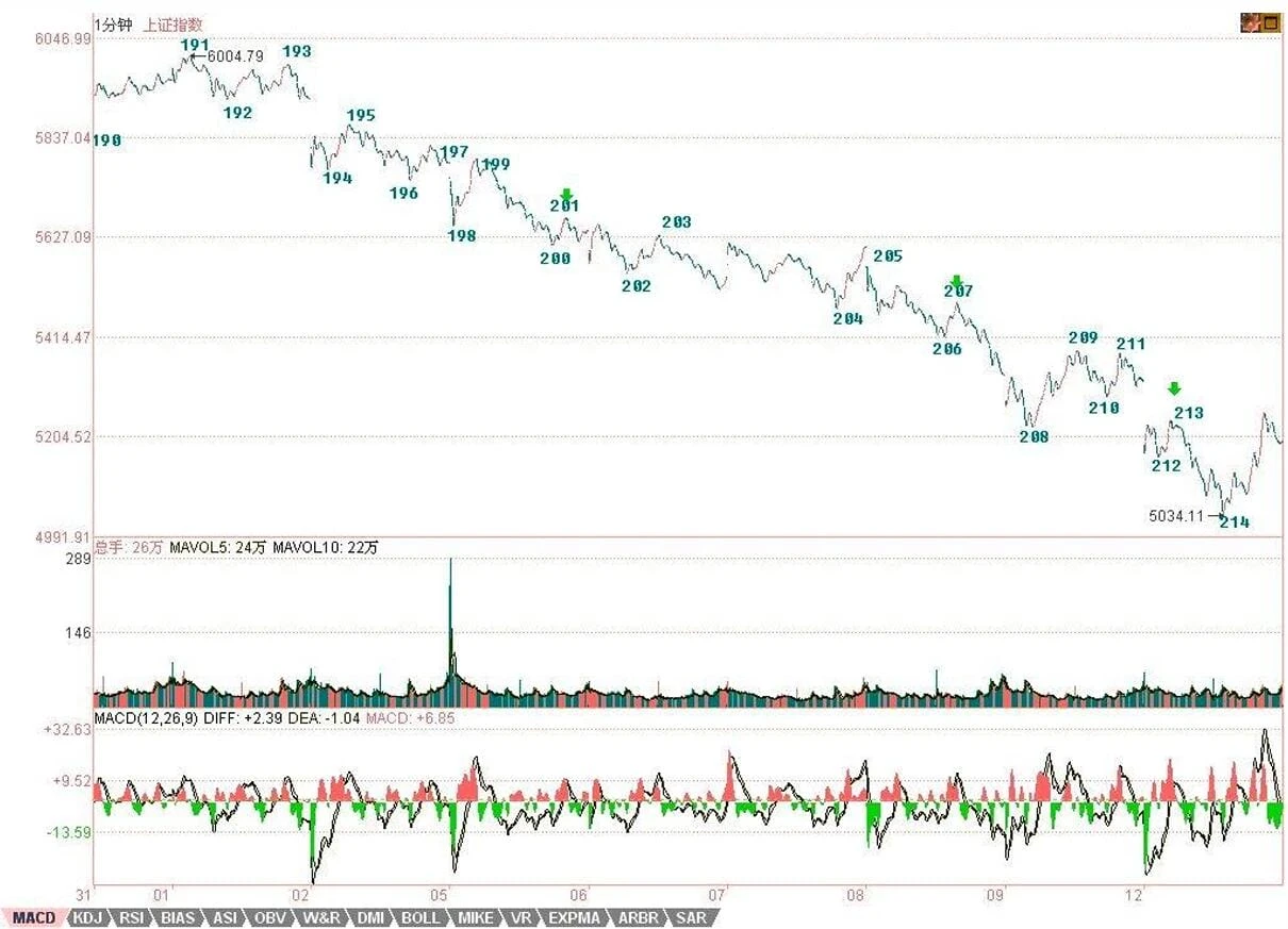 下面给出了6004下来的分段,请仔细研究,里面用绿箭头把三个1分钟中枢的第三类卖点都给标记出来了。按照本ID的理论,最晚的逃命点195处,从第1个绿箭头开始的所谓第三类卖点,其实都没什么意义,这里,只是显示,第三类卖点后,市场是可以多么狠。按本ID的理论,从195逃命的,在214才真正开始值得考虑是否回补。当然,前提是你的操作可以接受1分钟级别的,如果是5分钟以上级别的操作,那还是继续睡觉吧。