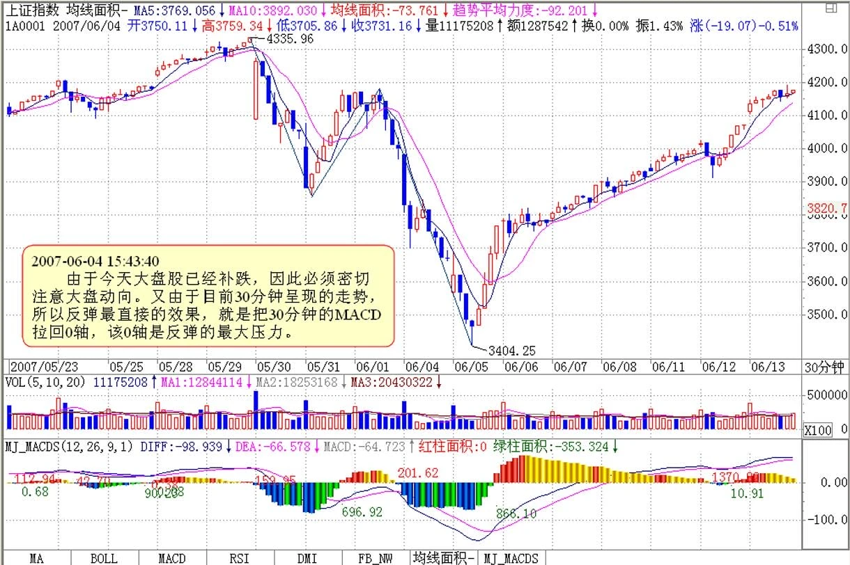 具体点位,还是上文中说的,5月均线是一个关键的位置,跌破该位置,站在短线角度,将是空头陷阱,至于能不能跌破该位置,就看下面的短线背驰点出现在什么位置上,这是技术比较好的最主要参考位置。由于今天大盘股已经补跌,因此必须密切注意大盘动向。又由于目前30分钟呈现的走势,所以反弹最直接的效果,就是把30分钟的MACD拉回0轴,该0轴是反弹的最大压力。