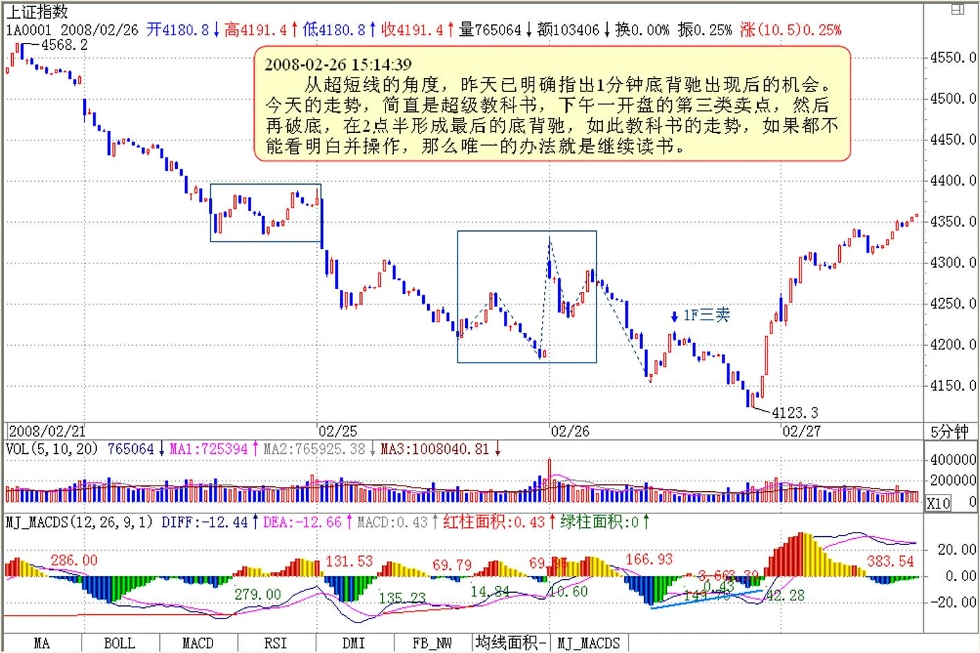 当然,从超短线的角度,昨天已明确指出1分钟底背驰出现后的机会。今天的走势,简直是超级教科书,下午一开盘的第三类卖点,然后再破底,在2点半形成最后的底背驰,如此教科书的走势,如果都不能看明白并操作,那么唯一的办法就是继续读书。