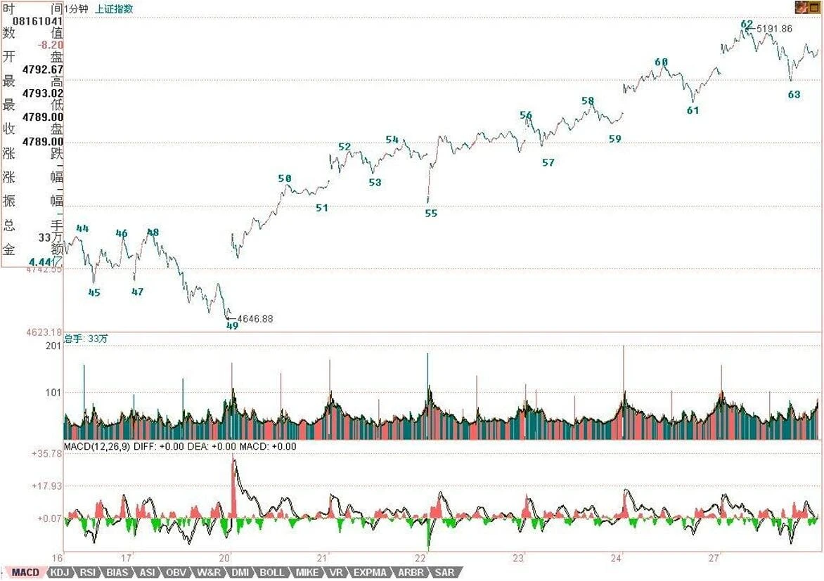 图形上,49点开始的走势简直是教科书。52-55的1分钟中枢,55-58的线段离开,58-59的回抽不跌回形成1分钟的第三类买点。然后,后面唯一的两种可能,更大级别中枢,与继续中枢上移直到出现新的1分钟中枢。显然,走势选择了后者,目前,可以暂时把这新的1分钟中枢看成是60-63。因此,从短线看,从49开始的1分钟上涨走势什么时候结束,就是短线唯一的主题。这相当简单,学过本ID课程的都应该怎么处理,应等待什么,那什么一出现,就该如何。(什么是什么?权当一个作业,这都不会,请复读。)