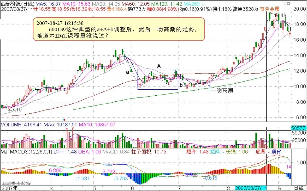 个股方面,有些人相当奇怪。竟然可以有这样的逻辑,例如对600139,他们意思是,如果不被洗干净,就不会有今天了,所以是本ID在犯坏,要把他们都给洗出去。然后这些人又在开始唠叨什么什么怎么还不怎样怎样,这些人,最该干的事情就是拿豆腐撞头去。知道本ID课程里对以前已经有的技术分析系统只说了均线系统吗?知道本ID在课程里说过,没有吻就没有高潮之类的话吗?均线系统没有粘合之前,怎么可能有单边的拉升?600139这种典型的a+A+b调整后,然后一吻高潮的走势,难道本ID在课程里没说过?就算今天的600343、000600,难道没看到前面消魂一吻吗?就算中铝这种上市没多久的,7月20日前后那一吻,请问够消魂否?