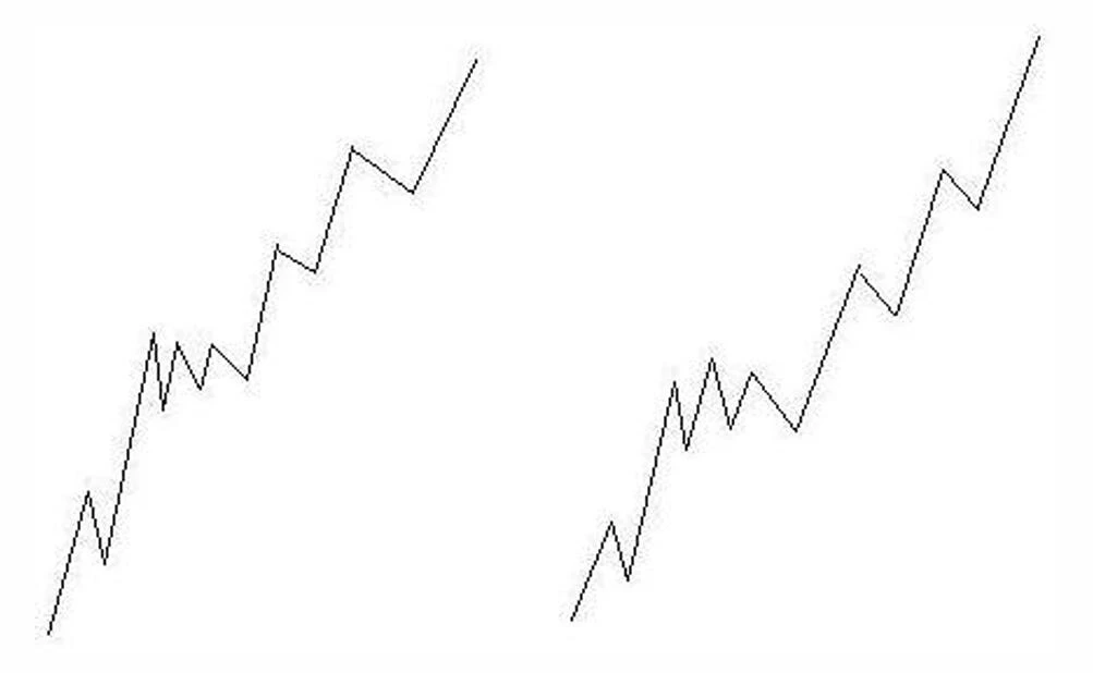 交卷:第一个是“上”线段,第二个是“上下上”三段,差别在第二个图,中间的“下上下”三笔低于前面“上”这段的第二笔的高点。