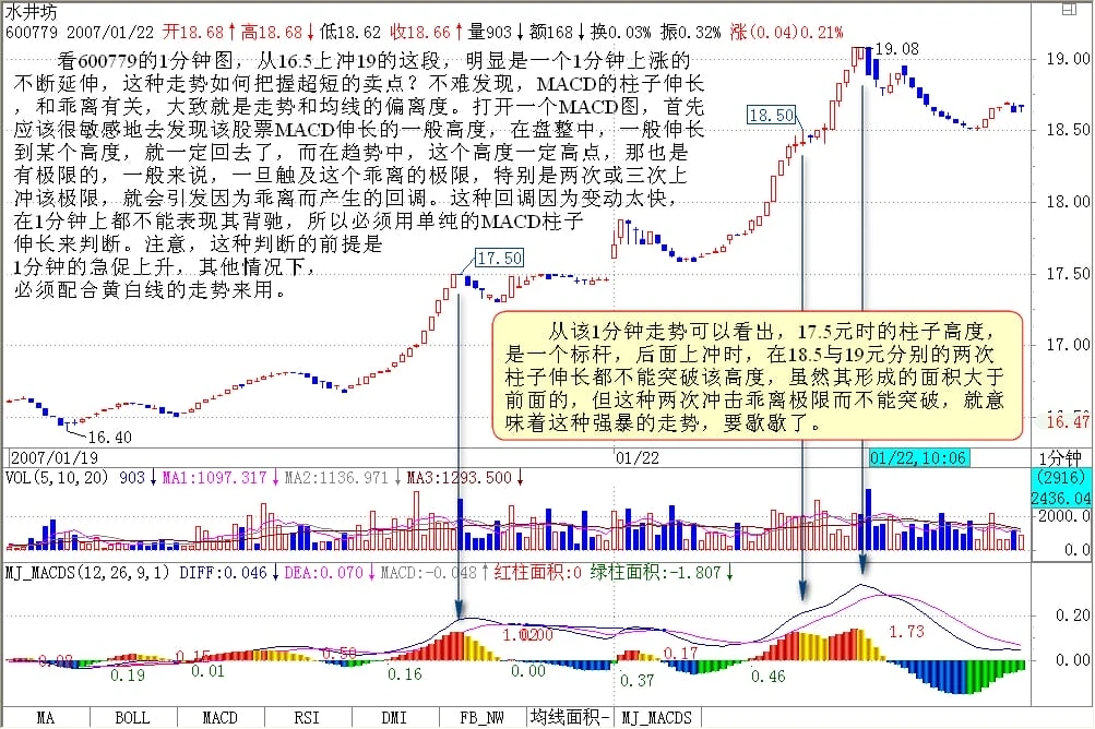 但“学如不及”,对事情如果不能穷根究底,最终都是“犹恐失之”的,因此,最终还是要把中枢等搞清楚。MACD,当一个辅助系统,还是很有用的。MACD的灵敏度,和参数有关,一般都取用12、26、9为参数,这对付一般的走势就可以了,但一个太快速的走势,1分钟图的反应也太慢了,如果弄超短线,那就要看实际的走势,例如看600779的1分钟图,从16.5上冲19的这段,明显是一个1分钟上涨的不断延伸,这种走势如何把握超短的卖点?不难发现,MACD的柱子伸长,和乖离有关,大致就是走势和均线的偏离度。打开一个MACD图,首先应该很敏感地去发现该股票MACD伸长的一般高度,在盘整中,一般伸长到某个高度,就一定回去了,而在趋势中,这个高度一定高点,那也是有极限的,一般来说,一旦触及这个乖离的极限,特别是两次或三次上冲该极限,就会引发因为乖离而产生的回调。这种回调因为变动太快,在1分钟上都不能表现其背驰,所以必须用单纯的MACD柱子伸长来判断。注意,这种判断的前提是1分钟的急促上升,其他情况下,必须配合黄白线的走势来用。从该1分钟走势可以看出,17。5元时的柱子高度,是一个标杆,后面上冲时,在18.5与19元分别的两次柱子伸长都不能突破该高度,虽然其形成的面积大于前面的,但这种两次冲击乖离极限而不能突破,就意味着这种强暴的走势,要歇歇了。