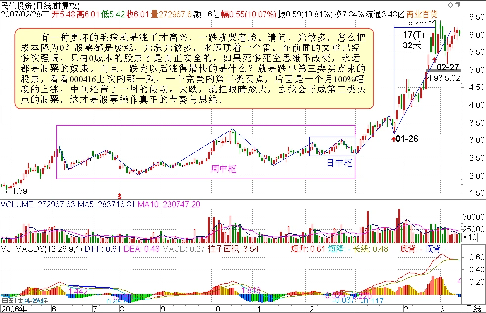 有一种更坏的毛病就是涨了才高兴,一跌就哭着脸。请问,光做多,怎么把成本降为0?股票都是废纸,光涨光做多,永远顶着一个雷。在前面的文章已经多次强调,只有0成本的股票才是真正安全的。如果死多死空思维不改变,永远都是股票的奴隶。而且,跌完以后涨得最快的是什么?就是跌出第三类买点来的股票,看看000416上次的那一跌,一个完美的第三类买点,后面是一个月100%幅度的上涨,中间还带了一周的假期。大跌,就把眼睛放大,去找会形成第三类买点的股票,这才是股票操作真正的节奏与思维。本ID的理论里没有风险的概念,风险是一个不可操作的上帝式概念,本ID的眼里只有买点、卖点,只有背驰与否,这些都是有严格定义的、可操作的,这才是让股票当你奴隶的唯一途径。