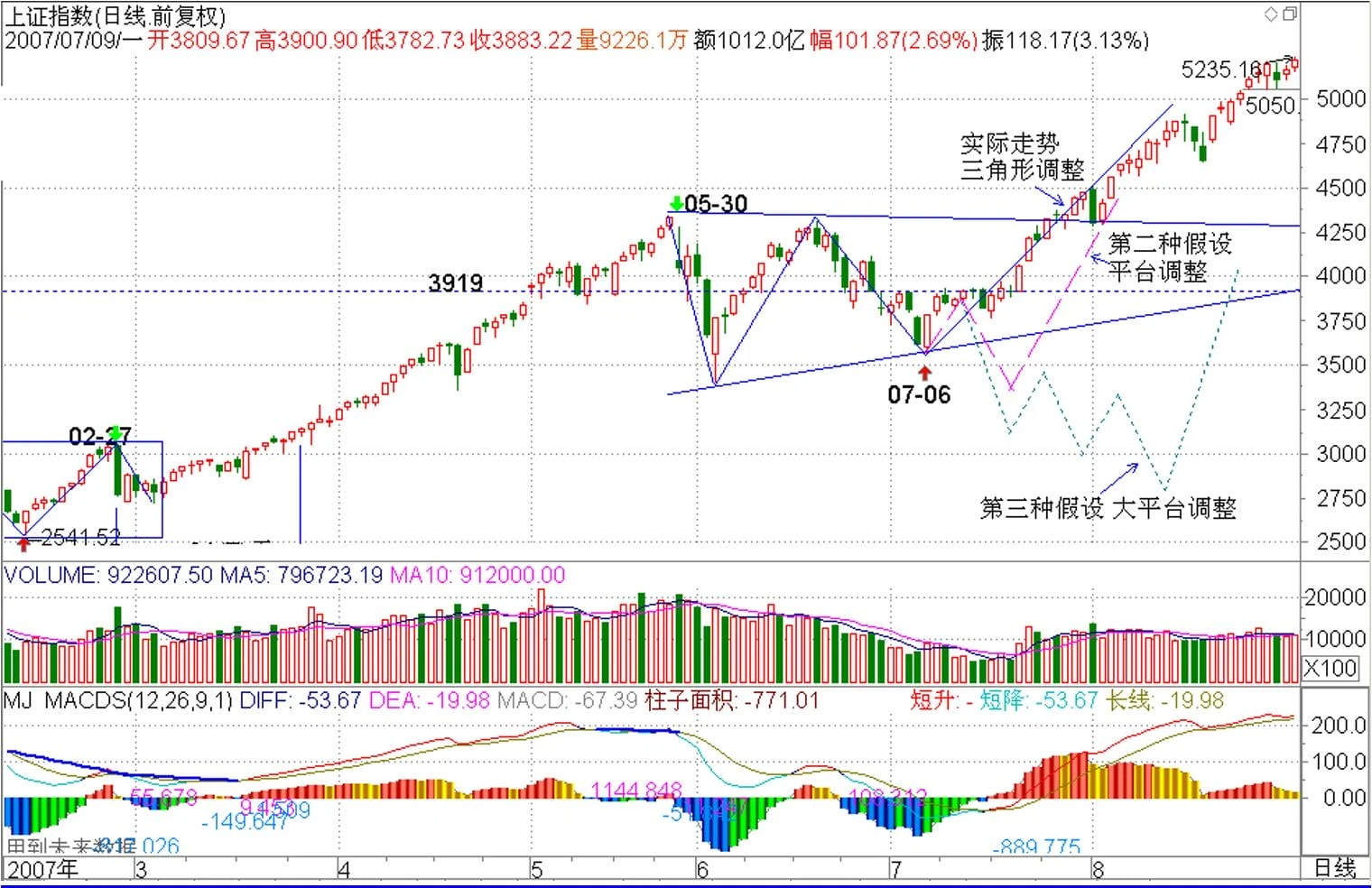 这种走势,要求的多方能量最大,具体走势分析,从530开始,大盘完成了三角形的前三段,目前正走三角形的第四段向上。这种走势要成立,前提就是要重新有效突破3919点的颈线,否则,如果没有足够能量达到这一点,大盘的三角形形态最终不可能成立。