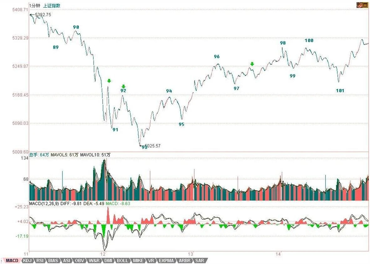 小级别图上,今天的走势在昨天已经明确说过,就是形成1分钟中枢,然后根据该中枢的震荡情况决定行情的发展。今天的走势,其实就干了这样一件事情。下周一的走势最简单,就是98到101这1分钟中枢究竟是先有第三类买点还是先有第三类卖点,如果是前者,那么这个1分钟的向上走势将延续,顶分型的破坏的可能性极大。如果出现后者,那么二次探底就不可避免,5周均线将继续受到考验。