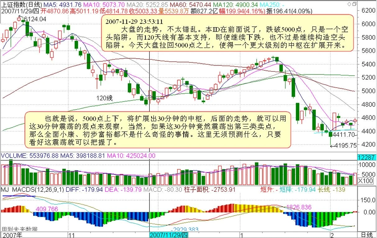 大盘的走势,不太错乱。本ID在前面说了,跌破5000点,只是一个空头陷阱,而120天线有基本支持,即使继续下跌,也不过是继续构造空头陷阱。今天大盘拉回5000点之上,使得一个更大级别的中枢在扩展开来。也就是说,5000点上下,将扩展出30分钟的中枢,后面的走势,就可以用这30分钟震荡的观点来观察,当然,如果这30分钟竟然震荡出第三类卖点,那么全面小康、初步富裕都不是什么奇怪的事情。这里无须预测什么,只要看好这震荡就可以把握了。
