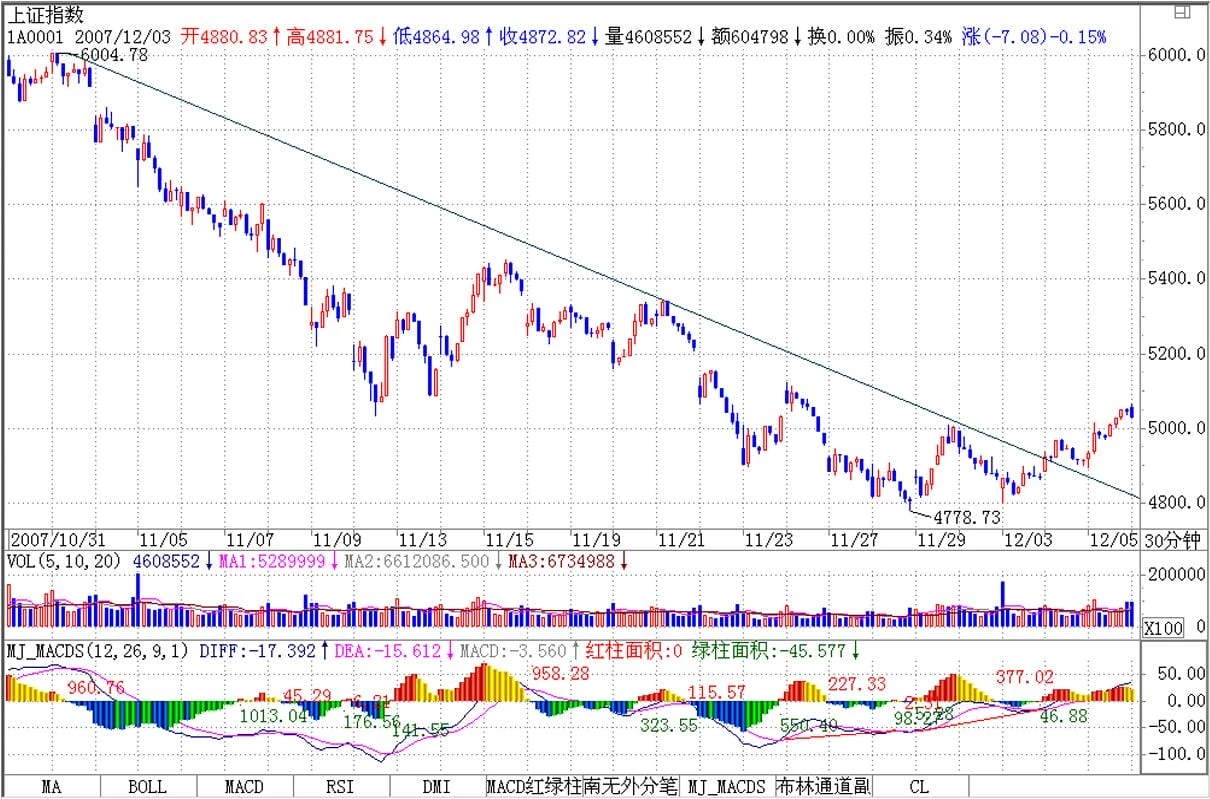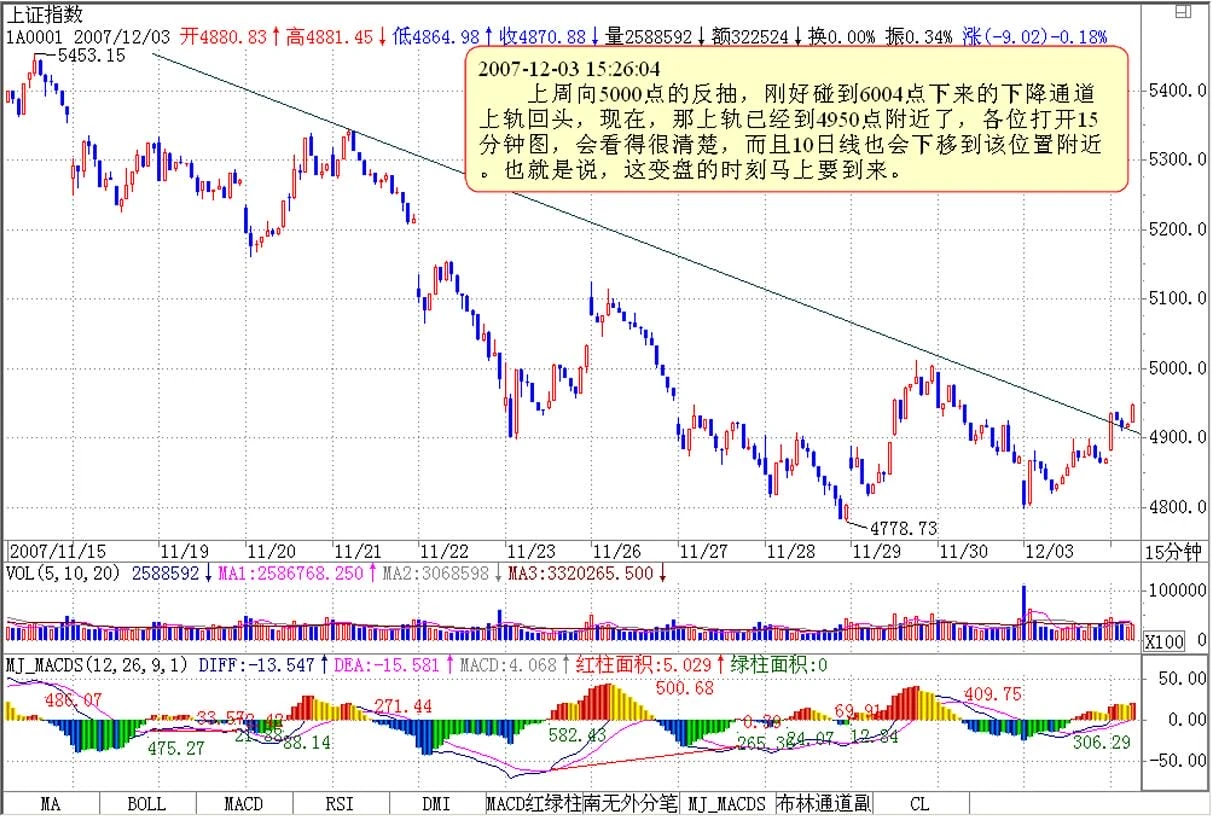 上周向5000点的反抽,刚好碰到6004点下来的下降通道上轨回头,现在,那上轨已经到4950点附近了,各位打开15分钟图,会看得很清楚,而且10日线也会下移到该位置附近。也就是说,这变盘的时刻马上要到来。