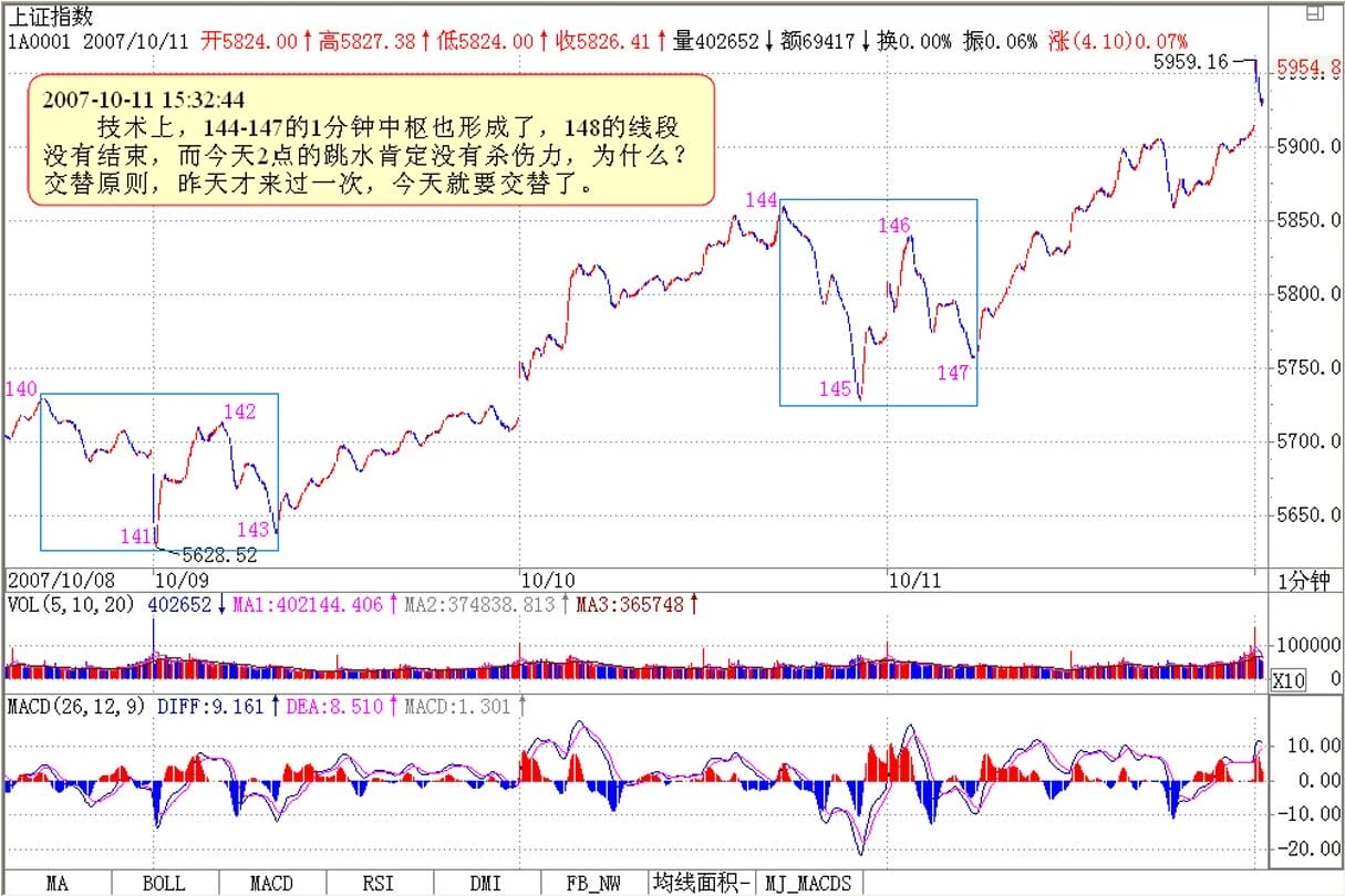技术上,144-147的1分钟中枢也形成了,148的线段没有结束,而今天2点的跳水肯定没有杀伤力,为什么?交替原则,昨天才来过一次,今天就要交替了。
