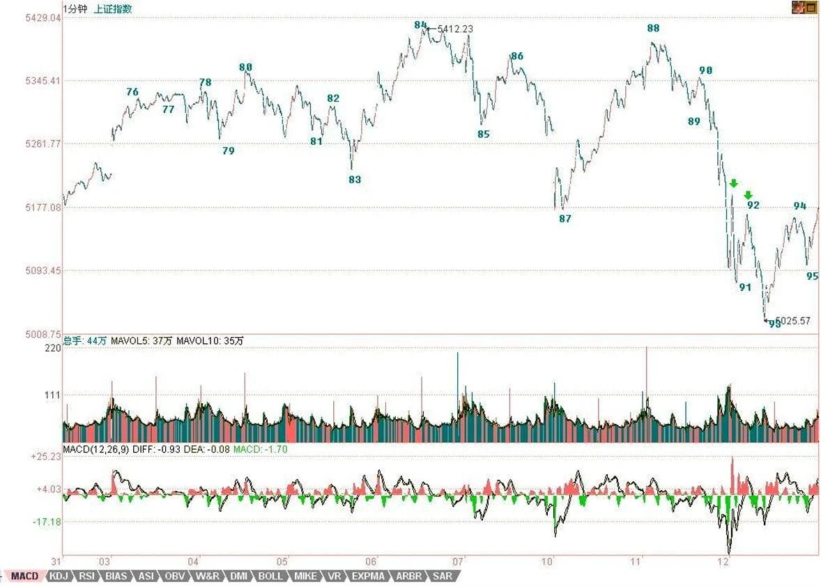 那么,现在后面的走势如何,很简单,84-93这个1分钟的走势类型离开76-85这个5分钟中枢后,就要看一个1分钟的走势类型的反抽能否出现回到79这一点,也就是5265点之上。不行,就构成这5分钟中枢的第三类卖点,后面至少要扩展成为30分钟中枢,最恶劣的,就是一个5分钟级别的下跌。