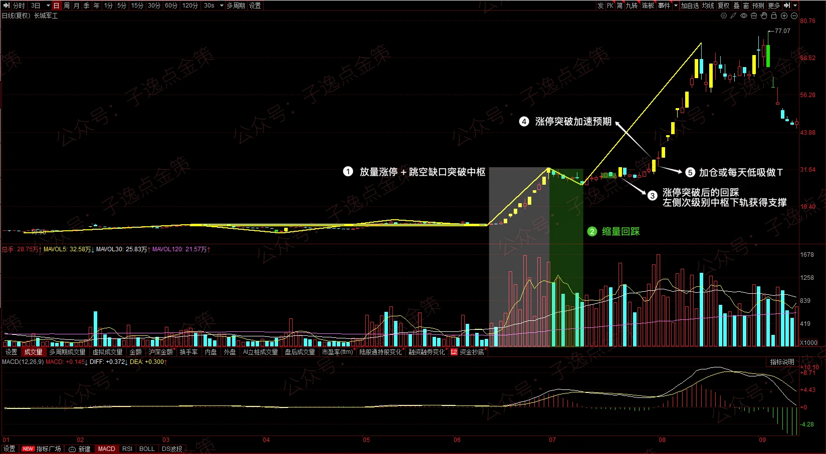 股价以极强的力度(通常是连续放量长阳/涨停 + 跳空缺口)向上突破中枢。随后的回调幅度极小,回调的最低点远高于中枢上轨,甚至是次级别一笔的缩量回踩完成。这种三买通常发生在市场的领涨龙头上。