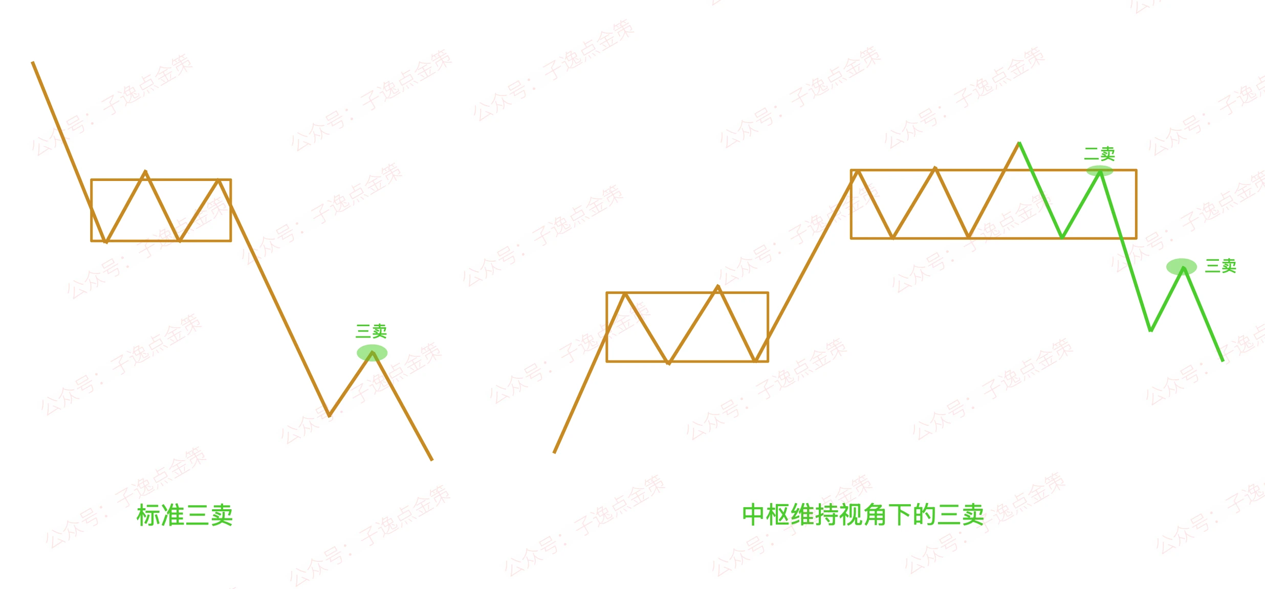 注意:下跌时存在2种三卖的情况,一种是标准的三卖;另外一种是中枢维持视觉下的三卖,出现在一段行情上升完成后的反向走势类型调整过程中,中枢维持后面的课程还会详细讲解,这里先有个大概记忆即可,以防实际投资中遇到可以马上用上。